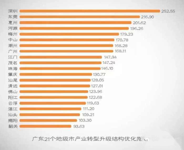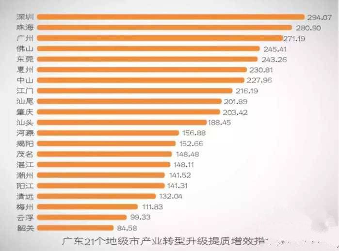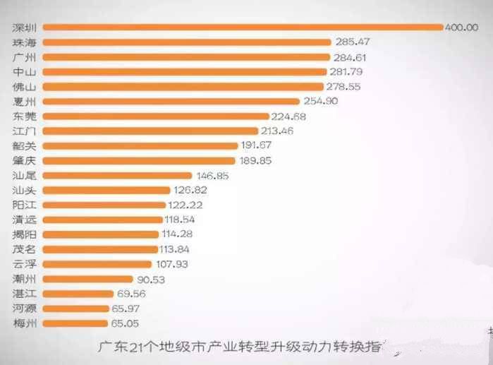 广东21个地市各式各类的排行榜, 例如GDP、平均工资、空气质量排行榜等, 每次都能引起大家的高度关注。 然而今天换一个角度, 从产业经济的方面看看, 广东产业转型升级推进如何? 21地市表现怎样? 你家乡的排名如何? 一起来看看吧↓↓ 这份排行榜如何来的? 都是依据哪些数据? 18日,“广东智库论坛”系列成果新闻发布会在广东社会科学中心举行,广东省社会科学院联合南方报业传媒集团共同发布《2017年度广东产业转型升级指数评价研究报告》。 课题组测算得出了21个地级市的产业转型升级指数。省社科院产业经济研究所所长向晓梅透露, 课题组通过深度剖析产业转型升级的内涵, 形成产业转型升级的 “动力-结构-效益”耦合机制框架, 并从产业转型升级的 动力转换 结构优化 提质增效 三个维度 (也就是上面三张各地市数据制图) 来构建产业转型升级指数评价指标体系, 提炼出三大类9个具有代表性的指标, 从不同侧面考察产业转型升级水平。 前三甲 :深穗珠 前十名单 第一名:深圳(942.31分) 第二名:广州(729.99分) 第三名:珠海(701.05分) 第四名:惠州(682.01分) 第五名:东莞 第六名:中山 第七名:佛山 第八名:江门 第九名:肇庆 第十名:汕尾 试卷分数下来了, 按惯例, 还是得分析下次怎么考得更好! 总体来看,广东21个地市产业转型升级成效有所提升。具体而言,21个地级市中,深圳、广州、珠海3个城市产业转型升级的指数综合得分在700分以上,产业转型升级进入了相对优化的阶段,新旧动能加速转换,现代化经济体系建设迈出坚实步伐。 惠州、东莞等4个城市综合得分在600分到700分之间,改造提升传统动能初见成效,但新动能培育则尚需时日。 从区域位置来看,产业转型升级指数得分较高的城市主要集中在珠三角地区,基本反映了广东产业转型升级区域格局——以深圳、广州、珠海等珠三角核心城市为主,其在发展新经济、培育新动能、建设现代化经济体系方面发挥着核心作用。 粤东西北这些“潜力股” 虽然与珠三角地区存在较大差距,但粤东西北部分地市结合各自产业基础和特点,通过大项目引进、龙头企业带动、产业共建等推动产业转型升级取得重要进展,且特色较为明显。 ◎汕尾、汕头:以节能减排为手段,推动传统产业转型升级 处于第三梯队的汕头,以科学发展观为指导,以提高产业发展质量和效益为目标,以大力发展规模工业为立足点,重点培育发展支柱产业、优势产业、特色产业,继续走新型工业化和“低碳”经济道路。 在继续发展原有优势传统产业的基础上,加大转型升级力度;注重对科技含量高、环境污染低、规模效益大的项目建设;加大对优势传统产业的技术改造和技术创新力度,做大工业规模,促进产业优化升级,实现工业经济快速和可持续发展。 在正确处理好节能减排与产业发展的关系方面取得成效,汕头单位GDP能耗指标排在第四名,仅次于深圳和珠海,表明汕头市在治理工业污染方面取得了明显成效,实现了经济发展与环境保护的良性循环。 ◎第三梯队的六个城市:创新能力不足成为制约产业转型升级 向晓梅分析称,第三梯队的六个城市(江门、肇庆、汕尾、河源、汕头、茂名)多为粤东西北城市,虽然产业转型升级总体水平相对珠三角地区仍处于较低水平,但以先进装备制造业为突破点、以节能减排为手段、以新一轮技术改造为主抓手,有效发挥了龙头企业的带动作用,在结构优化与提质增效方面得分较高,但是创新能力不足成为制约产业转型升级,实现由要素驱动向创新驱动转变的主要障碍。◎第四梯队的八个城市:产业转型升级总体水平较低 广东与先进省市有差距 企业R&D投入强度仍待提升 “广东产业转型升级总体在全国处于前列,但分项指标与先进省市都有一定差距。”向晓梅表示。 从国内比较看,广东产业转型升级动力转换的主要指标值远高于全国平均水平,但在国内6个发达省市中处于中等水平。而以广东省内处于第一梯队的深圳、广州和珠海三市与全国先进省市相比,深圳的相关指标大幅领先,广州、珠海也处于较高水平。 从研发投入上看,广东工业企业R&D经费占工业增加值的比重在逐年提升,2016年达到5.13%,高于浙江(5.02%)而稍低于天津(5.14%)和江苏(5.44%),但与北京、上海等科研大市相比还存在较大差距,仅相当于上海(6.49%)的79.04%、北京(6.33%)的81.4%。 “深圳造”机器人 值得注意的是,广东全省在工业企业人才投入上,与江苏、天津、浙江、上海相比仍有不小的差距。而广东省内的深圳和珠海在该指标上分别达到了133.48人年和100.67人年,远高于其他先进省市,广州也接近上海的水平,这表明深圳、珠海和广州作为广东省内第一梯队城市,在很大程度上也支撑了广东创新型人才的培养,是广东实现产业转型升级动力转换的主要动力源。 |