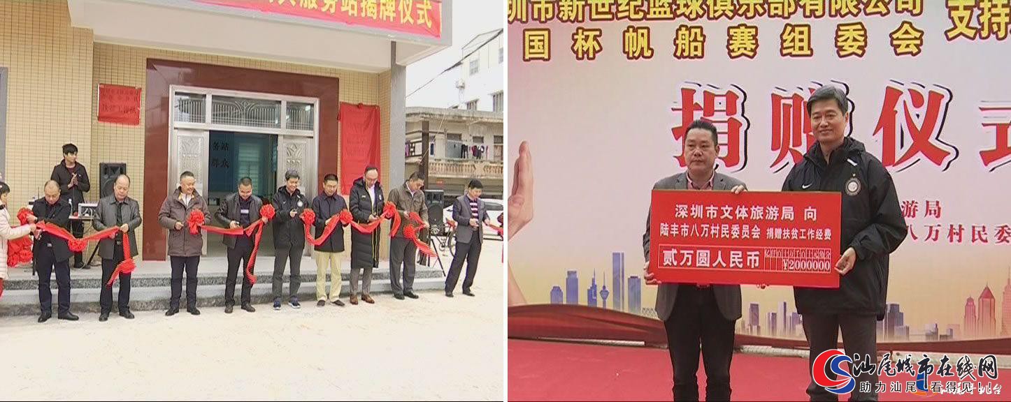 深圳市文体旅游局到陆丰开展精准扶贫活动 深圳市文体旅游局也于日前组织扶贫工作组和爱心企业员工,到对口帮扶的陆丰市八万镇八万村开展精准扶贫活动,为该村党群服务中心落成揭牌,了解驻村扶贫工作开展情况。当天,扶贫工作组向八万镇政府和八万村委捐赠扶贫工作经费,举行慰问贫困群众物资发放仪式,看望慰问贫困群众,深圳市新世纪篮球俱乐部和中国杯帆船赛组委会也向八万村捐赠了扶贫资金。