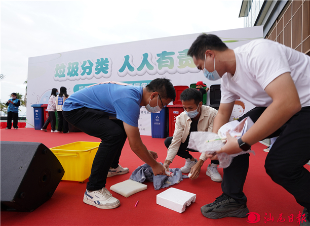 汕尾日报讯 (记者 黄奕锋 文/图)11月6日,由市委宣传部指导,市住建局、城区人民政府主办,市公安局、市卫健局、市市监局、城区城管局、马宫街道办、汕尾日报社、汕尾广播电视台协办的垃圾分类进社区宣传活动在市区马宫街道金町保利社区举行。活动旨在深入学习贯彻习近平总书记对垃圾分类工作的重要指示精神,践行“垃圾分类就是新时尚”的绿色环保理念,进一步推动社区群众垃圾分类习惯养成。 活动以“垃圾分类 人人有责”为主题,通过节目表演、互动游戏(如右图)、彩车环游、自行车骑行和派发宣传资料等形式,向社区群众宣传生活垃圾分类知识,增进社区群众对垃圾分类意义的了解,引导大家养成垃圾分类的良好习惯。活动结束后,群众纷纷表示将从身边做起、从点滴做起,养成垃圾分类的好习惯,并发动身边人一起参与到垃圾分类行动中来。 |