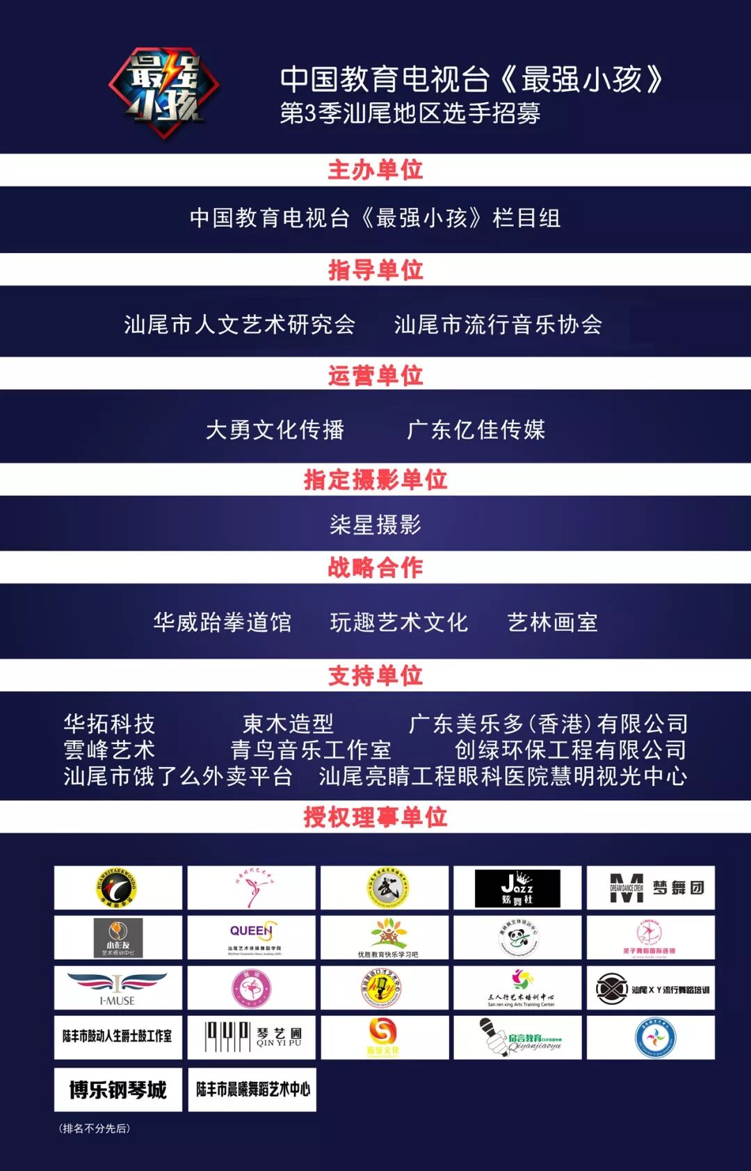 奔走相告 《最强小孩》第三季全国选手招募 汕尾赛区马上启动 等你 就是那个最强小孩 《最强小孩》第三季全国选手招募汕尾赛区 启动仪式 时间:2019年5月18日晚上8:00 地点:汕尾市城区景福居装饰材料城 景福居装饰材料城地处汕尾市区湖滨大道中心核心地带泰濠世纪豪庭首层,是汕尾地区唯一大型的家居装饰建筑材料一站式采购中心。建筑面积达20000平方米,拥有品牌商户近50多家,荟萃全国各地知名品牌;项目广阔的发展空间将引领行业先驱,缔造商业传奇。 谁是最强小孩 锁定19号 首场开进 《最强小孩》第三季全国选手招募汕尾赛区 富力悦禧海选专场 时间:2019年5月19日下午4:00 地点:汕尾市红草区红草大道中段富力悦禧花园销售中心 富力集团,中国房企综合实力十强,25载布局全国各地及海外市场,全球超120个城市和地区,精筑300余个精品项目。2017年,富力集团及国际城市运营商高度,强势落子红草高新区要地,缔造高品质精英人居。 下面就让我们走进《最强小孩》 一起来了解一下 最强养成计划 《最强小孩》是由中国教育电视台联合国大华闻倾力打造的国内首档原创少儿养成教育真人秀节目。节目以“不一样的生活经历,不一样的成长收获”为主题,旨在情商、财商、艺能、体能、文化礼仪、国际视野六大方面对少儿进行全方位养成教育,引领我国广大少年儿童的茁壮成长。 四级赛事 十四项活动 只为最强小孩 城市赛(初赛、复赛、城市决赛) 全国总决赛 节目录制 初赛(海选)比赛规则 【晋级规则】 本次比赛采用三位评委制,晋级/待定名额由评委举牌决定。进入正式比赛时,第一、二号选手的评分结果不给予现场举牌,待到第三号选手展示完成后,由主持人从第一号到第三号依次报号,评委依次举牌。从第四号选手开始即以现场举牌的方式进行。 【评分方法】 1、个人评分办法:现场评委根据选手的个人自我介绍+舞台个人自选展示内容,进行综合评分(含评委有需要进行即兴简单导试) 2、团体评分办法:现场评委根据团体节目的整体水平为主。团体不能晋级而个别选手有独特表现的,可以取其个人晋级 【评分规则】 参赛节目的选手根据编号顺序依次登台表演,如遇评委示意举牌时参演选手停止表演,评委现场举牌。 1)、●●●有三位评委举“绿”牌时,该参赛节目视为直接晋级,进入下一轮比赛。 2)、●●有两位评委举“绿”牌时,该参赛节目视为“待定”,赛后由三位评委商确后拟定:或晋级,或重新参加海选,或淘汰。具体情况遵照官方公布或联系通知。 活 动 组 织 媒体支持 顾问委员会 【名誉主席】 林义鸿 【名誉副主席】 周坚镇 林智辉 王汉有 陈文钦 彭永福 【顾问】 李晨康 安信企业总经理 黄淑富 汕尾市点赞传媒有限公司总经理 ‖ 汕尾时代网/街头巷尾TV创办人 蔡木森 汕尾在线网主任 余志远 汕尾市城区文化志愿者协会副会长 ‖ 城区个私协理事 唐广源 汕尾微讯 李文坤 汕尾城市在线网 杨鹏程 汕尾鹏程网 孙炳锐 汕尾前线 王航星 海丰报料网 叶幸羲 汕尾市民生网站长 ‖ 汕尾锐达传媒有限公司总经理 陈伟锋 休闲陂洋吧总经理 徐胜慧 汕尾天天五折 张小游 飞米传媒 梁珈可 汕尾文教艺体网 林仁游 汕尾市舞蹈家协会名誉主席 叶子尤 摄影顾问 姜泽洪 广东鹏港律师事务所 (以上排名不分先后) 组织委员会 【主 席】梁文博 【副主席:徐燕定 梁惠有 【秘书长】大 勇 【副秘书长】王华涵 【秘书长助理】柳成行 执行委员会 【执行主席】唐广源 【执行副主席】孙炳锐 王妞妞 叶伟玉 【策划组】田晓峰 王华涵(兼) 【摄制组】刘开兴 钟建荣 黄可彬 吴锦聪 【舞美组】唐夏塬 张秀坤 卢俊豪 邹嘉树 程祖顾 梁培洲 黄良跃 陈嘉帆 黄换合 颜烈琪 【媒体组】孙炳锐(兼) 【后勤组】柳成行(兼) 委员会理事成员 马小宝 汕尾炫舞社创始人 王 强 信武文体培训中心 郑小全 国家注册普通话与口才测评师 吴佳颖 中国舞蹈家协会注册舞蹈教师 王文燕 XY流行舞蹈培训创办人 中国舞蹈家街舞协会会员 Victo 中国学生艺术体操专业教师&裁判员 曾佩欣 I-Muse缪思文化创始人 叶杰如 优胜教育 快乐学习吧主任 卓妙琼 钢管舞教练与形体礼仪师 陈鸿飞 中国舞蹈家协会街舞委员会指导老师 蔡惠丽 孕产理疗瑜伽师 |