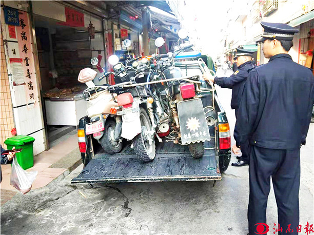 该区执法人员在查扣乱停乱放摩托车